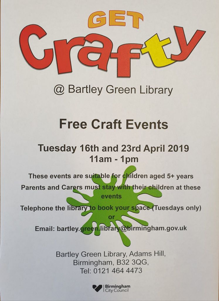 BARTLEY GREEN - BIRMINGHAM LOCAL EVENTS Tuesday 16th April 2019 11:00 am - 1 pm CRAFTY