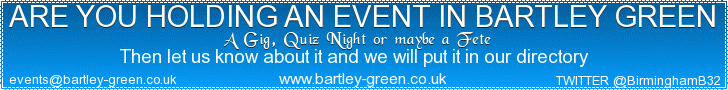 BARTLEY GREEN LINKS BARTLEY GREEN PHOTOS THIS SITE IS UNDERDEVELOPMENT IF YOU WANT TO CONTACT ME OFFERS OF HELP SUGGESTIONS OF CONTENT OR ANYTHING ELSE web@bartley-green.co.uk or Mobile 07742864571 THIS IS A HOBBY NOT A BUSINESS PLEASE BE PATIENT |